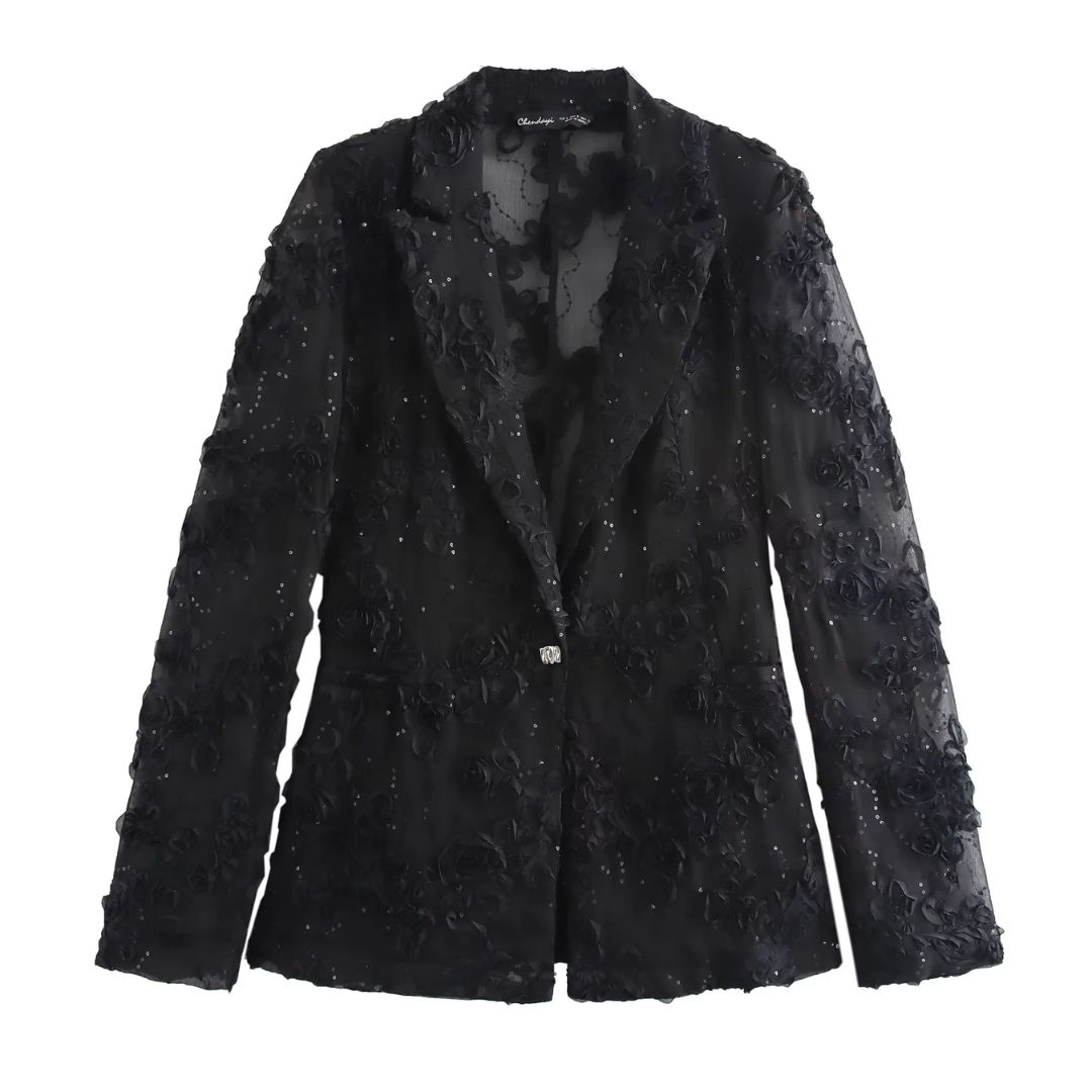 Blazer: Der Blazer hat eine strukturierte Passform mit klassischen Revers und langen Ärmeln. Er ist aus einem Stoff gefertigt, der eine leichte Textur und einen dezenten Glanz aufweist, was ihm einen luxuriösen Touch verleiht.